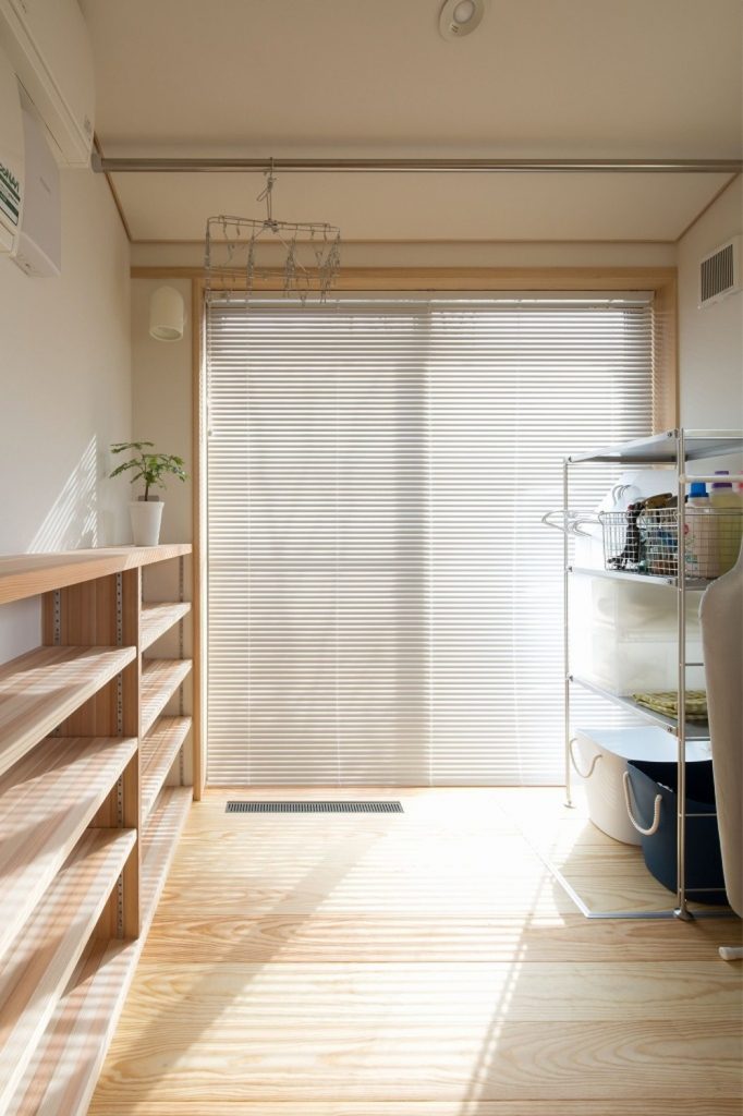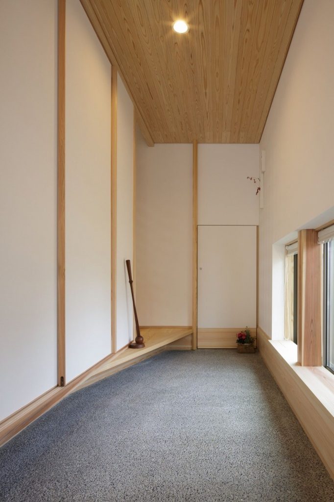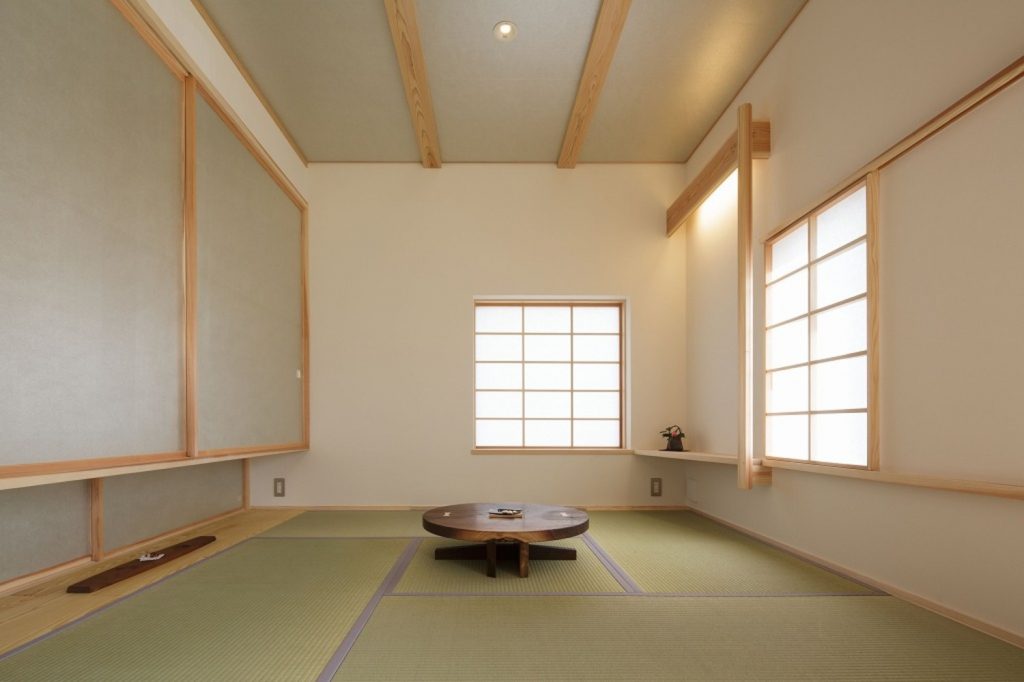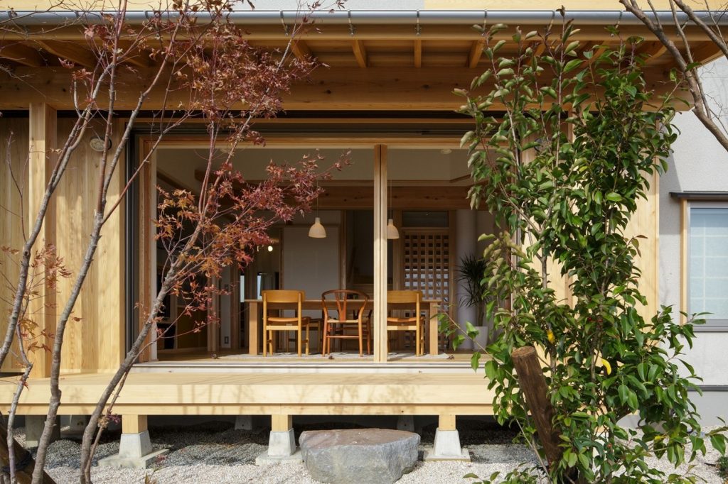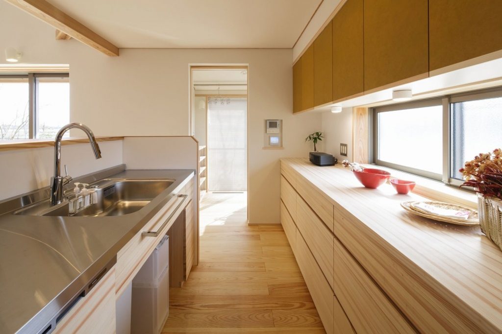 大きな吹き抜けの下、家の真ん中にリビングダイニングを配置。リビングとダイニングを兼用の空間にし、外と繋がる開口部を設けたことで、30坪以上の広がりを感じられる「小さくつくって広く住む」木の家です。広い吹き抜け空間を設けながらも、全館空調システムのおかげで均一な室内環境を実現しました。また、キッチンや洗面、和室などの木部・和紙のあしらいも注目ポイント。日本らしさを残しつつ、シンプルで飽きのこないデザインに仕上げています。