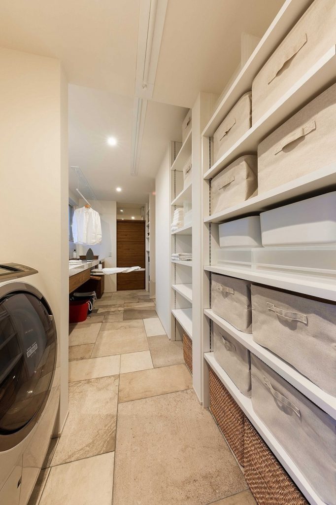 洗濯干しからアイロンがけ、収納まで一直線で完結する動線。