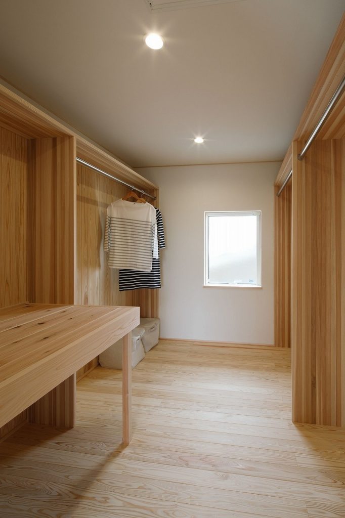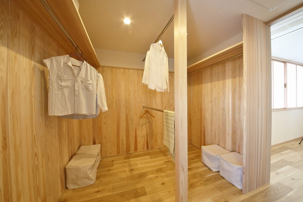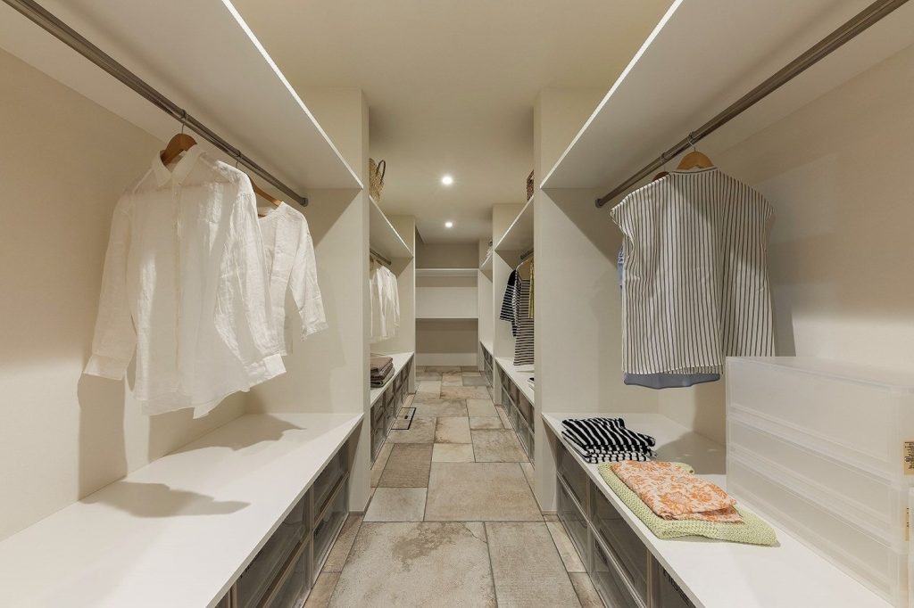 リビングと水廻り、扉を2つ設けてどちらからもアクセスできるウォークスルークローゼット。