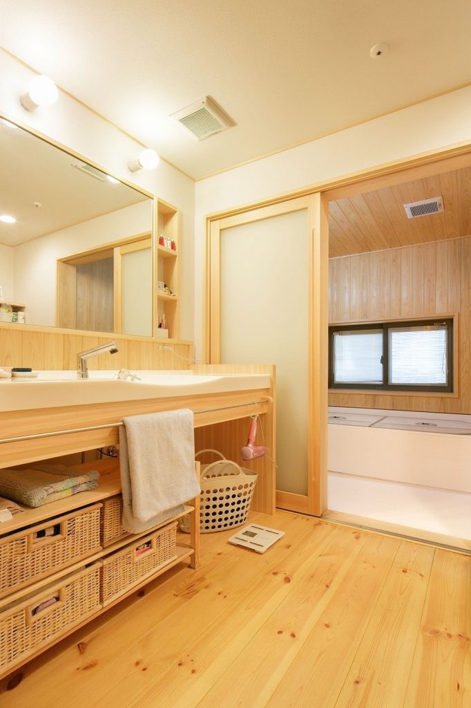 シンク下をオープンにした造作洗面。使用する収納ケースやかご類を変える場合も融通が利きやすいですね。