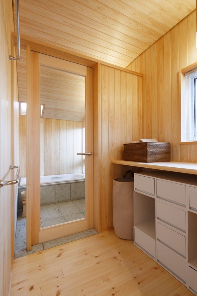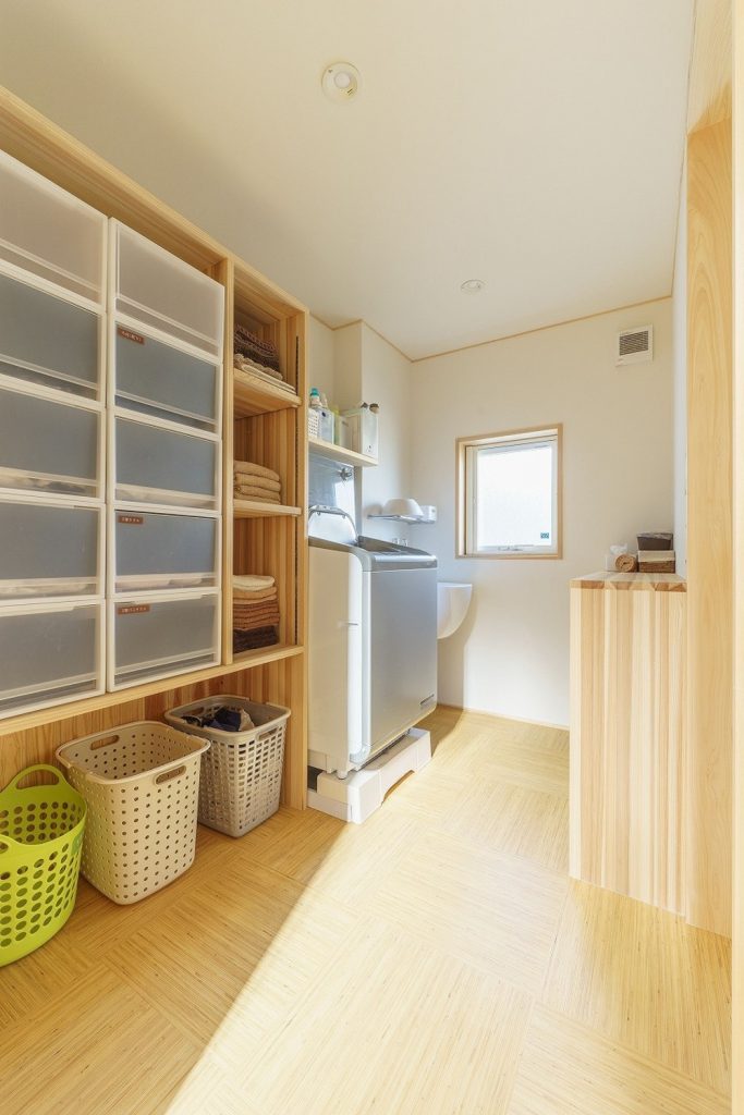 洗面スペースとは別空間の脱衣室。タオルや着替えの収納はここで完結。