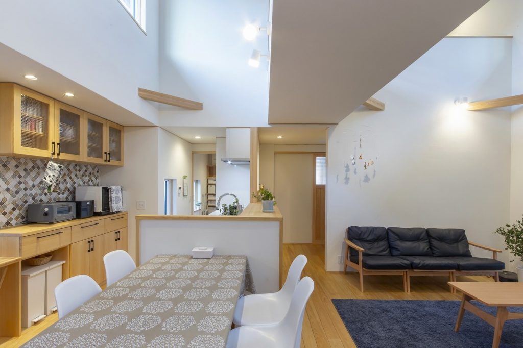ダイニング側、リビング側どちらの吹き抜けからも自然光が降り注ぎ、清潔感のある明るい空間になりました。