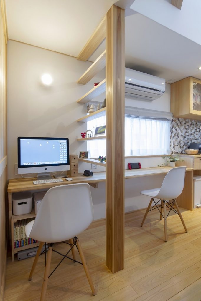 リビングの一角には家族の共有カウンターを。柱を利用した棚には、お気に入りや家族のお気に入りをディスプレイ。
