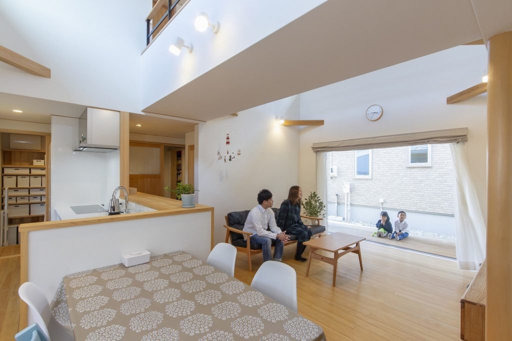 天気の良い日はウッドデッキも団らんの場に。キッチンから家全体が見えるのも安心です。
