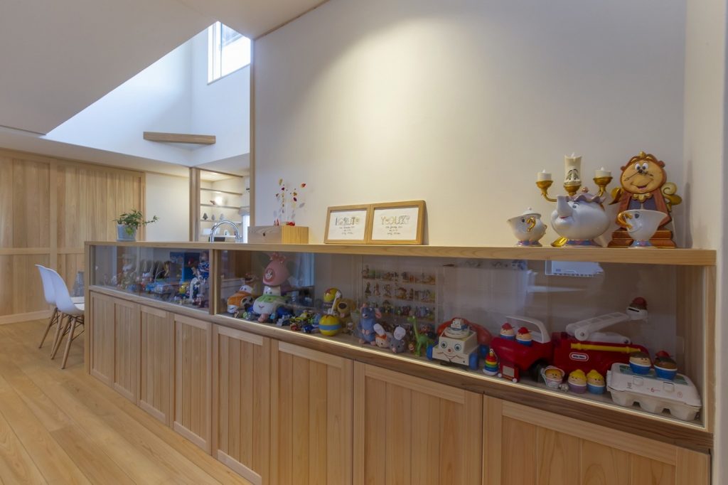 趣味のコレクション専用の棚を設けたキッチンカウンター。下段にも書類や日用品をしっかりと収納できます。