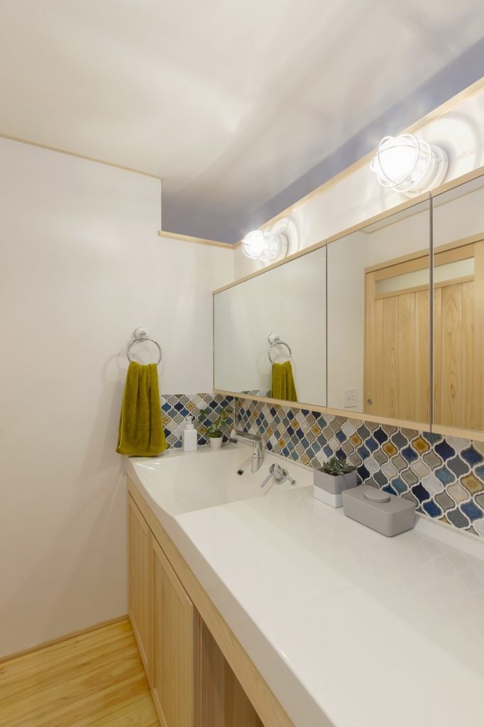 造作の洗面台には、キッチンと色違いのタイルを採用。家族が並んで使用できるカウンターと鏡もこだわりです。