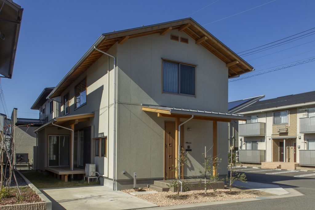 住宅街の角地、切妻屋根のシンプルで落ち着いた佇まいが目を惹きます。