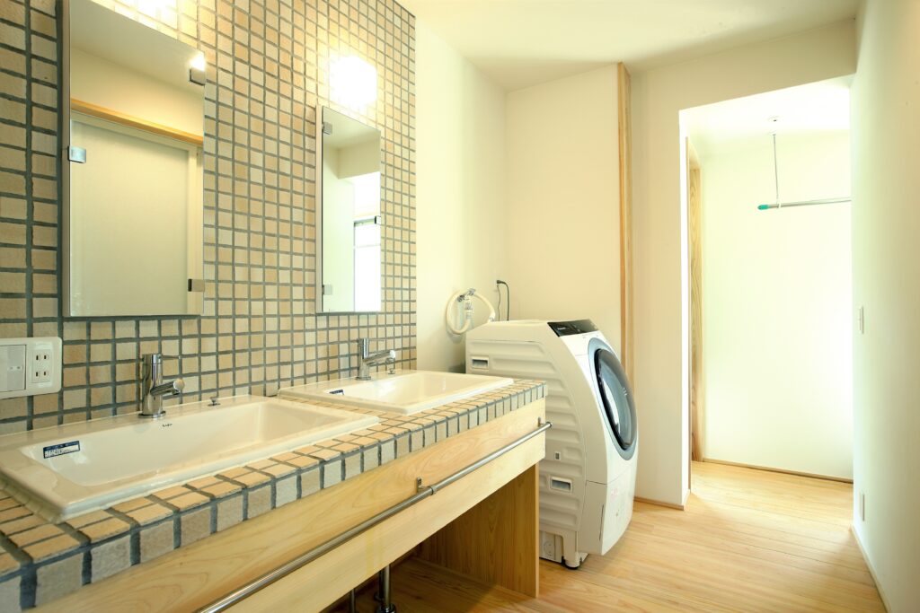 シックなタイルをあしらった造作洗面台。忙しい朝の時間帯も家族で使える広さを確保しました。