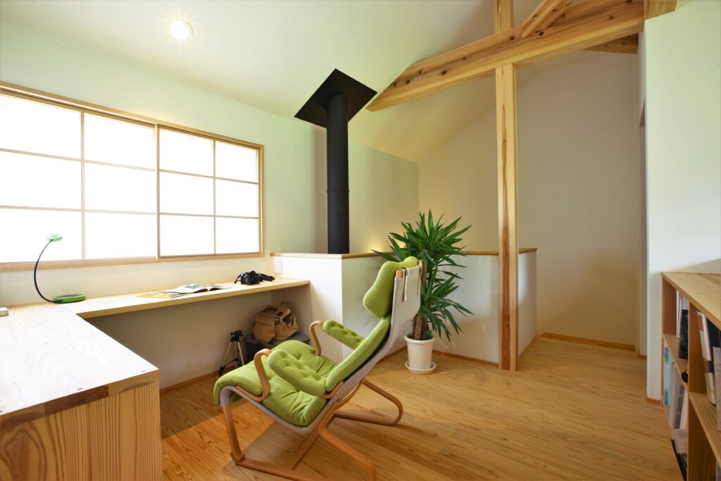 2階の吹抜けホールには書斎カウンターを。障子からのやさしい光が手もとを照らしてくれます。