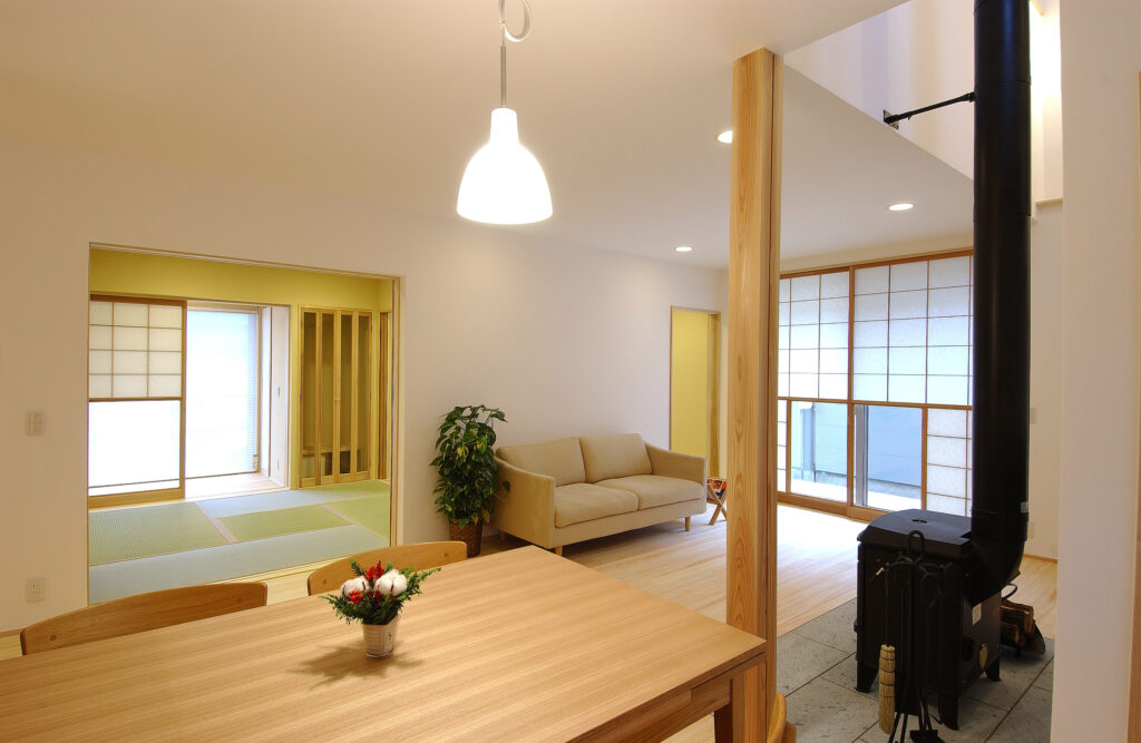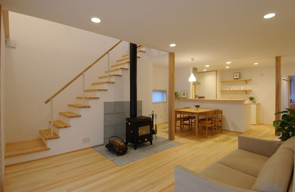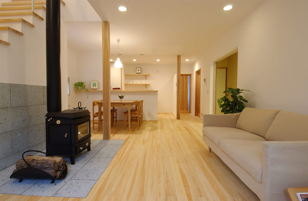 家族みんなの暮らしの中心になる場所にこの薪ストーブがあります。 自然と家族が集まるあたたかいリビングです。