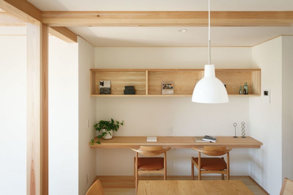 ダイニングの隣には家族の共有スペースを。子どもたちの宿題にお父さんのパソコン、お母さんの家事まで、みんなで使える万能スペース。