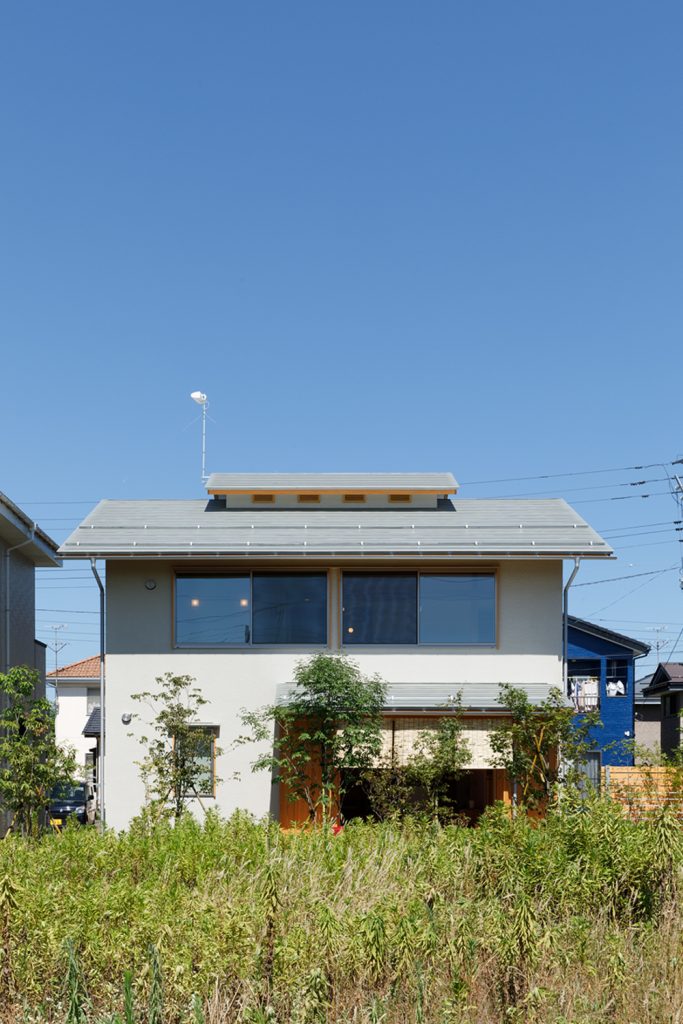 2Fに配置した大きな窓。 吹抜けを通して、陽の光を室内に取り込みます。 軒先も長くしているので、夏の厳しい日差しも和らげながら光を取り入れます。 コンパクトな形が見て取れる外観です。