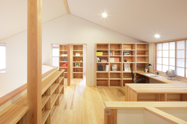 2階のホールには、ご主人のお仕事スペースと大容量の本棚。お施主様の持ち物に合わせて作る造作収納は、使い勝手も空間の統一感もばっちりです。