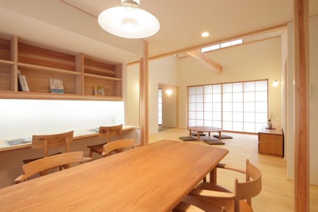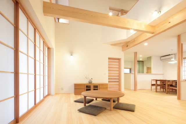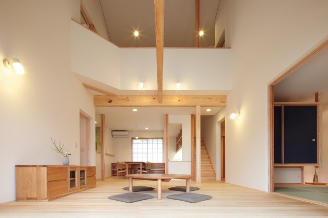 大きな吹き抜けから落ちてくる、障子を通したやさしい明かりがご家族をつつみます。