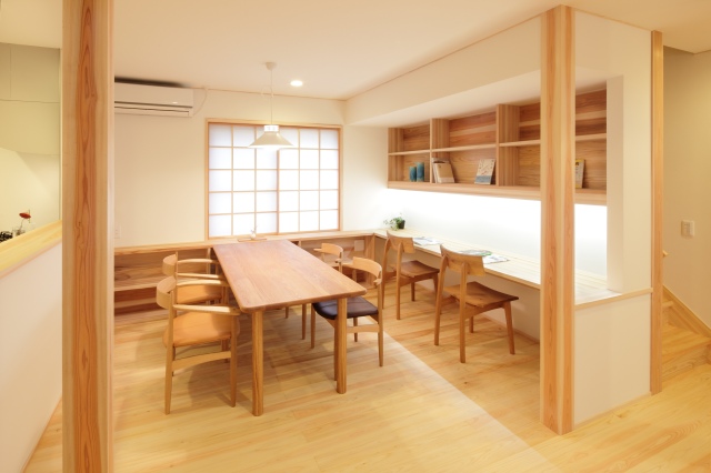 食事の場所とすぐ背中合わせにある、みんなで使うカウンター。 これだけ近ければ、宿題でわからないところがあったらすぐにお母さんに教えてもらえますね。