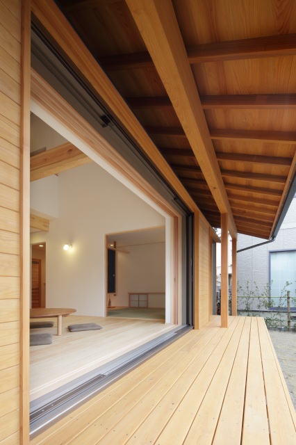 広く屋根をかけたウッドデッキ。リビングの一画かと思うくらいのつながりです。 天気のいい日はここでおやつを食べたり、お昼寝したり♪夏の夜はビールもいいですね! 全開口のサッシはたくさんの光と風を家族のくつろぎの場をもたらしてくれます。