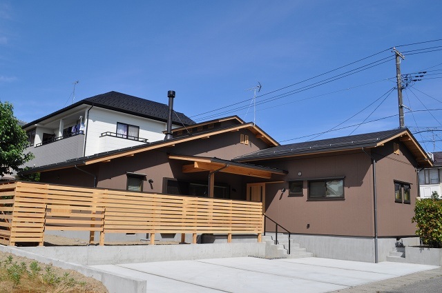 のびやかな屋根と木製フェンス、やわらかな壁の色合いでバランスのとれた外観。