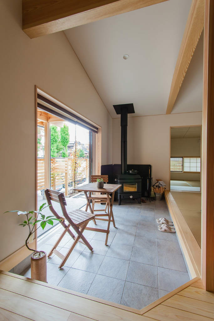 玄関ポーチにひらく「土間」はI様邸ならでは。 中でも外でもないこの空間、地域のひととのコミュニケーションの場として、リビングの延長として、 外作業の場として、お子様の遊び場として… 使いかたは無限大ですね。