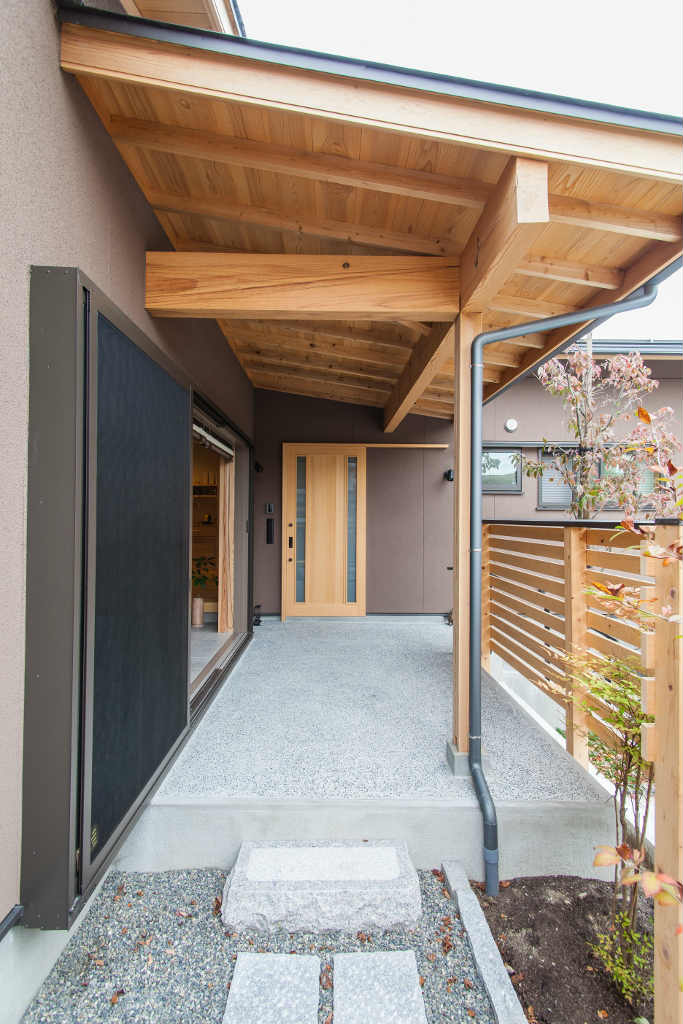 土間ともつながる玄関ポーチ。 伝統的な豆砂利洗い出しの床と、木のパーツで高級感ある雰囲気に。
