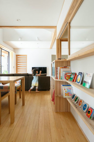 キッチンカウンターには作り付けの棚。お子様の目線と同じ高さで、絵本選びもたのしそう。