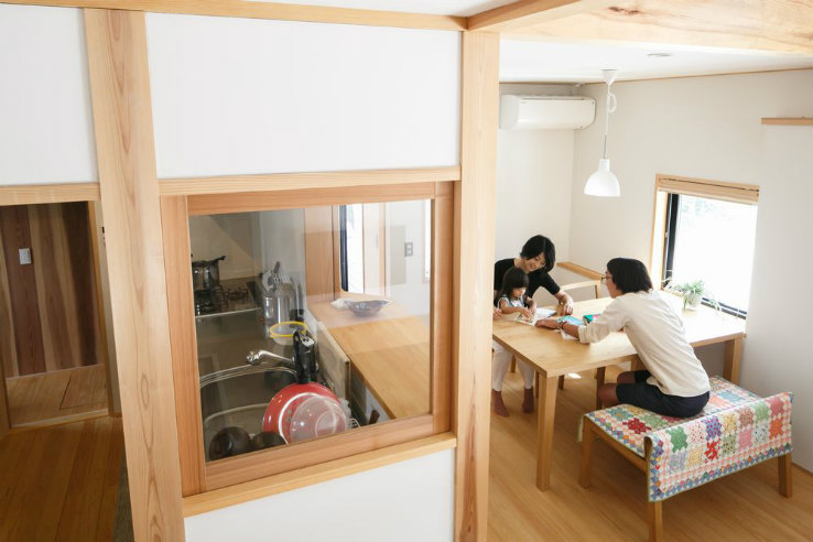 キッチンは対面式で家族とのつながりを大切にしつつ、 開閉できるガラス戸をつけてプライベートな空間にも対応。