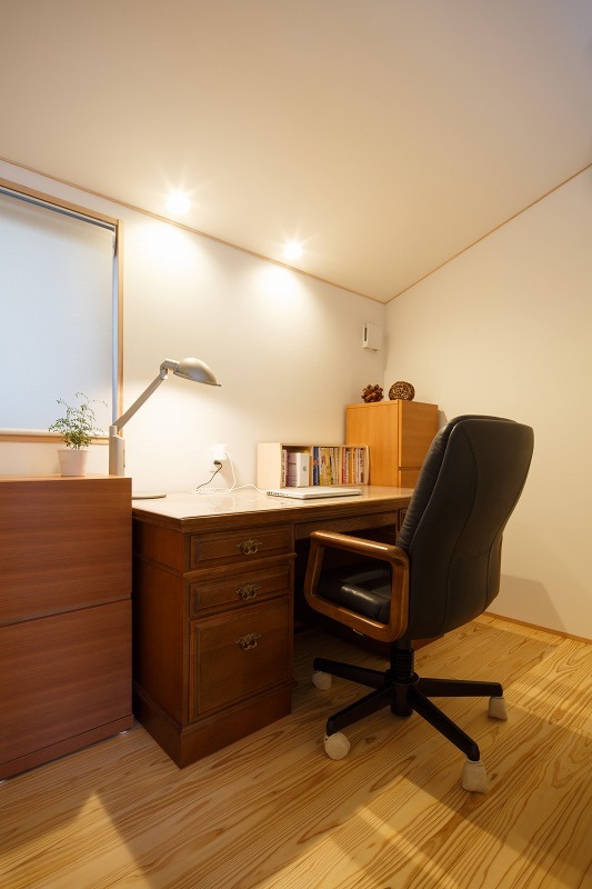 ご主人のデスクが味のある雰囲気を出す書斎。低めの天井で落ち着く空間。