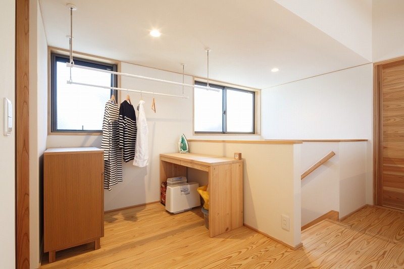 2階ホールでは洗濯干しやアイロン掛けを。奥様お気に入りのスペース。