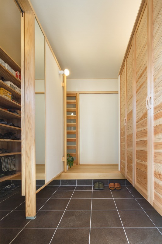 二世帯共有の玄関。玄関を共有することで、お互いが程良い気配を感じられる。