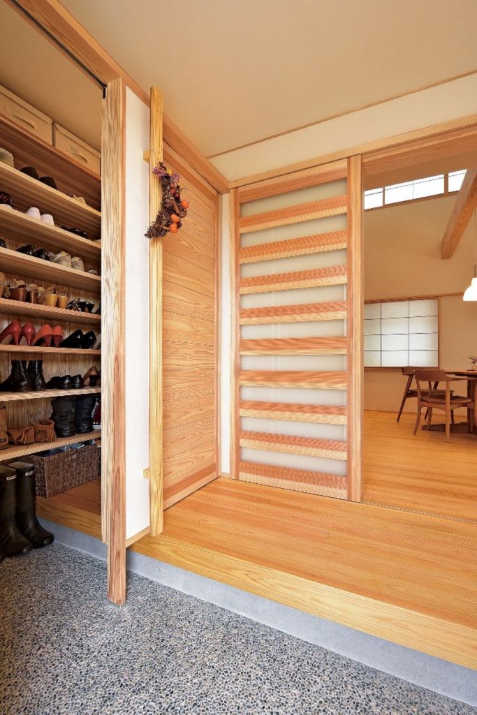 玄関の戸を開けると、視界いっぱいに広がる木の質感。引き戸で仕切ることができる大容量の下足収納も。