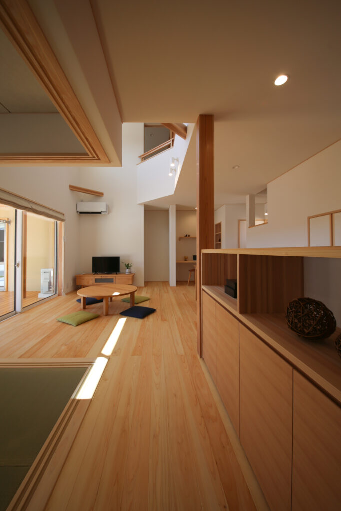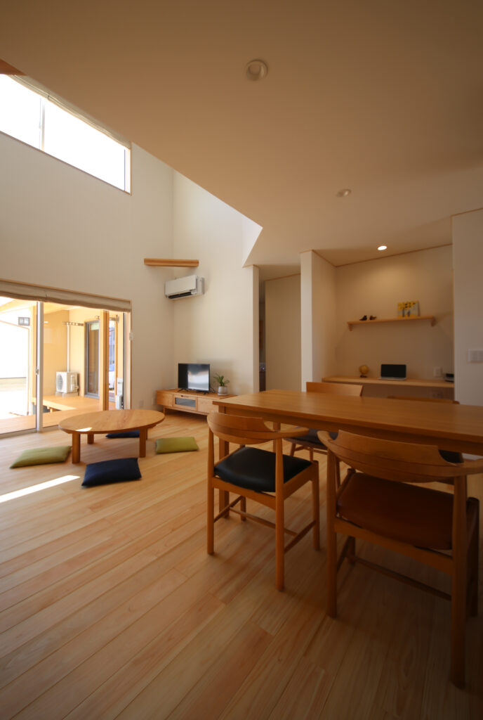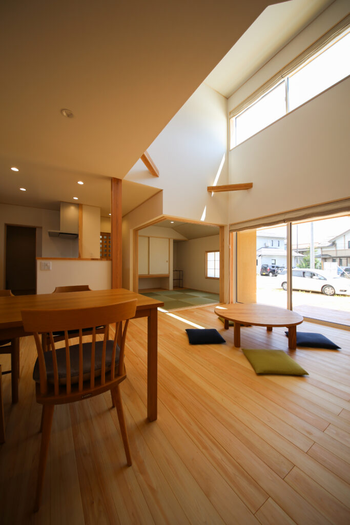 実は、延床32坪と見た目よりもコンパクト。1Fの床面積(25坪)を広くし、生活スペースと寝室も集約していて、1Fだけでも生活が完結できる間取りで、2F(7坪)にはトイレと子供室・収納だけという「半平屋」の木の家。