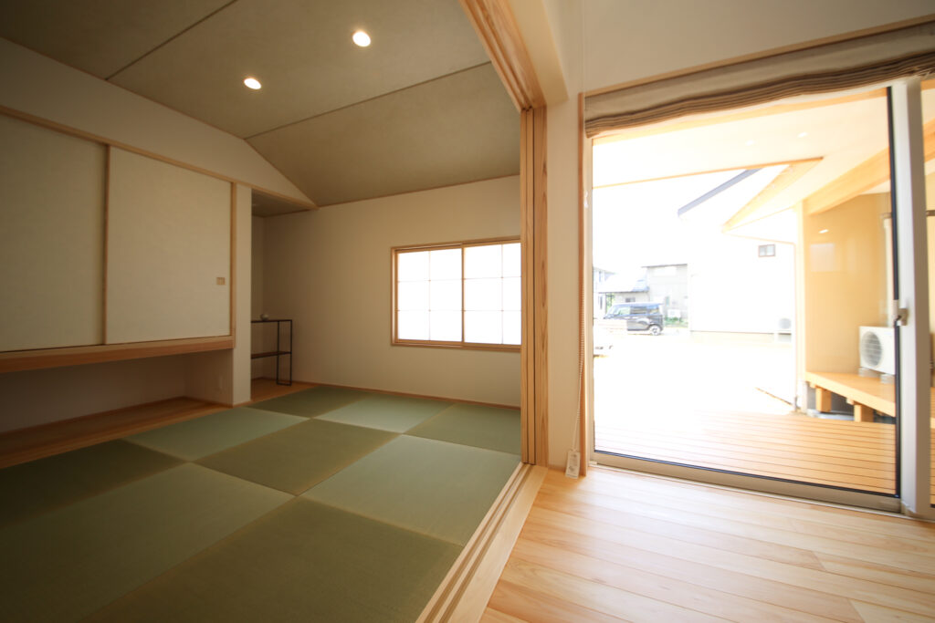 4.5帖の国産い草の畳が心地よい和室。襖戸を閉めると個室になり、普段開けておくとリビングとも一体的に広々と使える。小さなお子様の遊び場やお昼寝の場所にも。