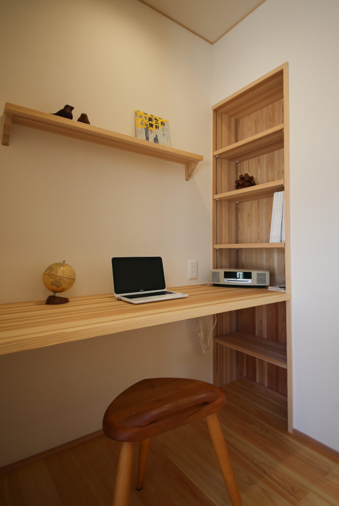 ダイニング背面に飾り棚や可動棚も組み込んだ造作の書斎カウンター。テレワークやPC作業、お子様の勉強や書き物をするときも便利な場所。