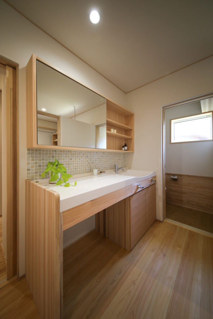 ゆったりとした広さのカウンターとスライドできる鏡、収納棚など機能とデザインを両立した造作洗面。
