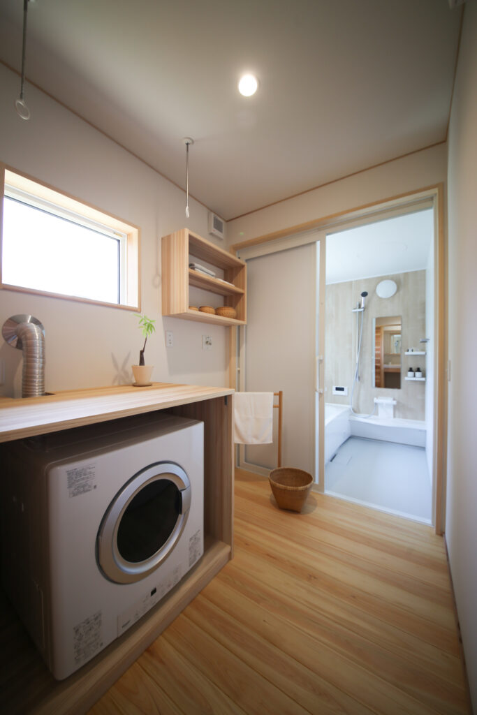 ランドリールーム/脱衣室。ガス衣類乾燥機 幹太くんで物干しの効率も格段にアップ。
