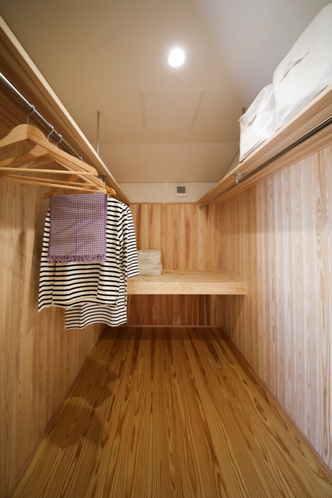 寝室の隣には約3帖のクローゼット。二面に設けられたハンガーパイプや枕棚、中棚など収納力も抜群。家族で共有するものや衣類もスッキリと収納できる。