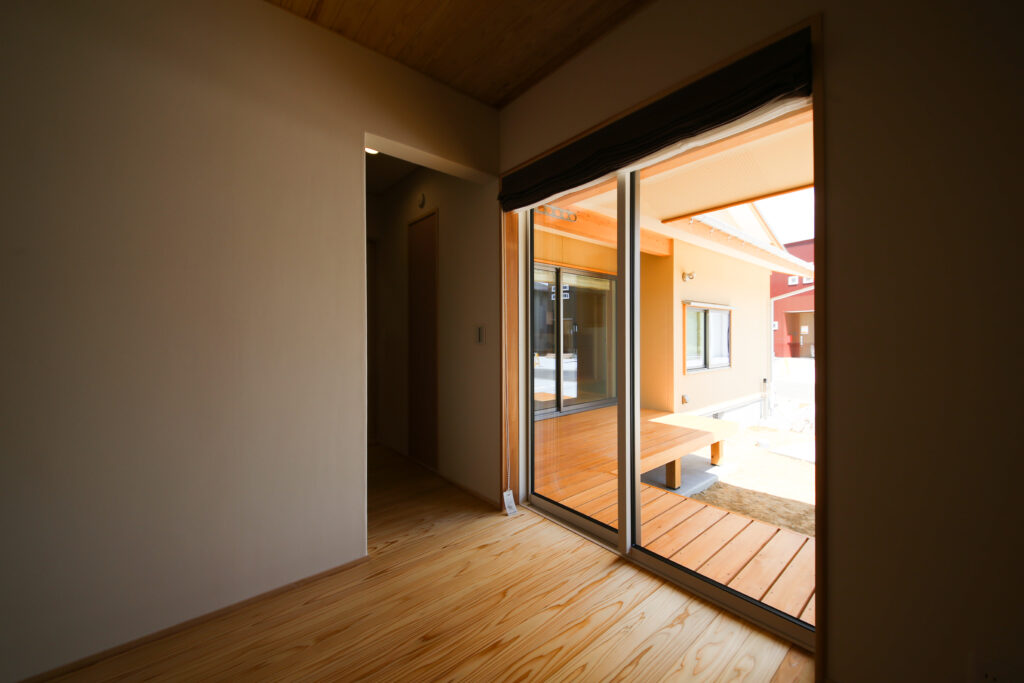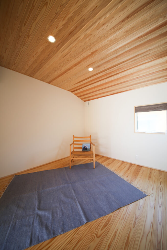6帖の寝室の天井には杉の羽目板を張り、他のお部屋と少しテイストを変えて落ち着いた空間に。
