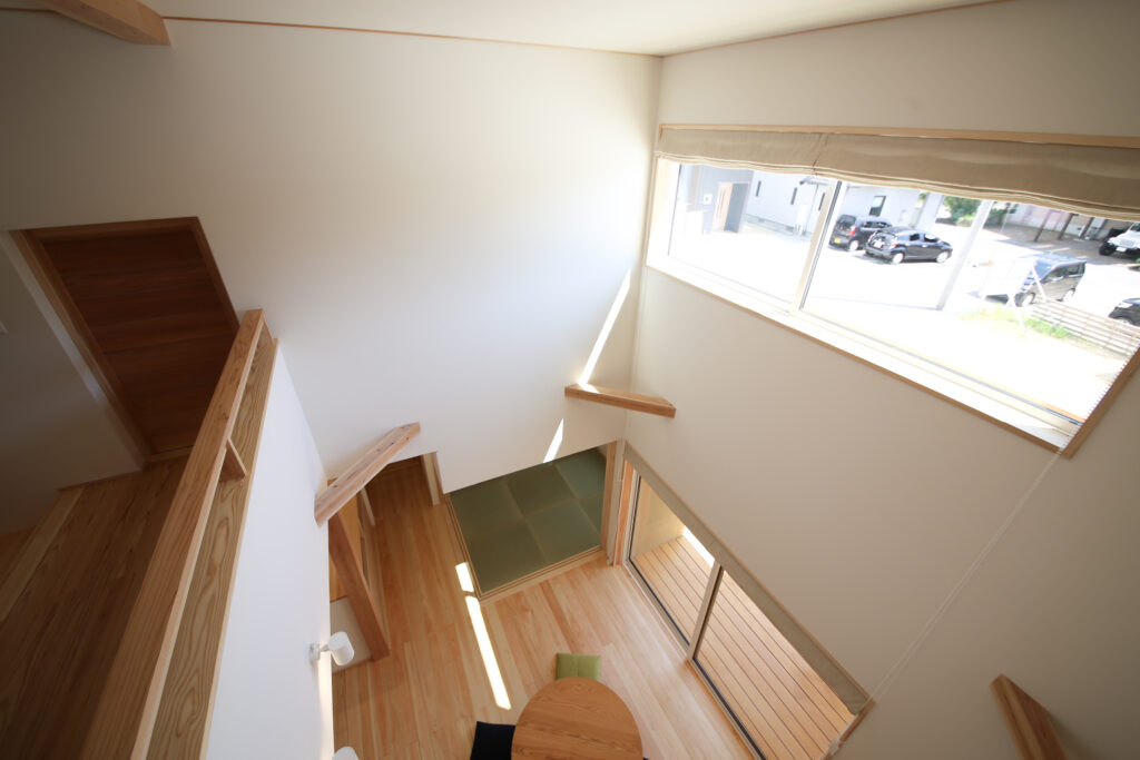 吹抜けからは、リビングも眺められ、家族の気配も感じられる。