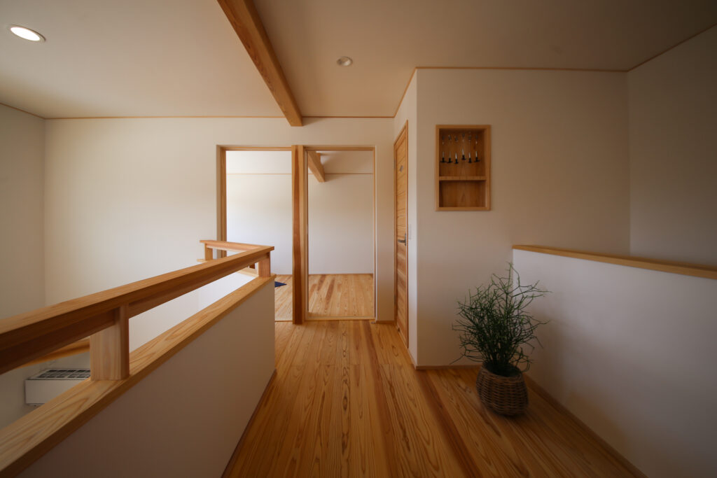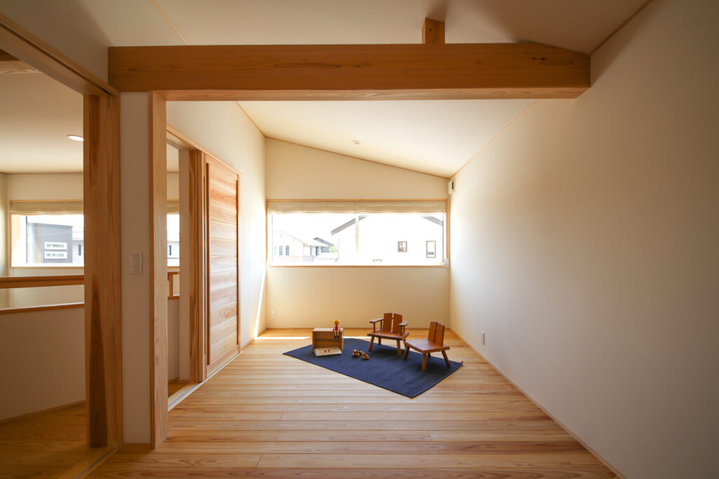 2Fのホール~トイレ・子供室。2Fは約7坪と最小限の居室にして、1Fに生活機能を集約させ平屋ライクなお家になっている。