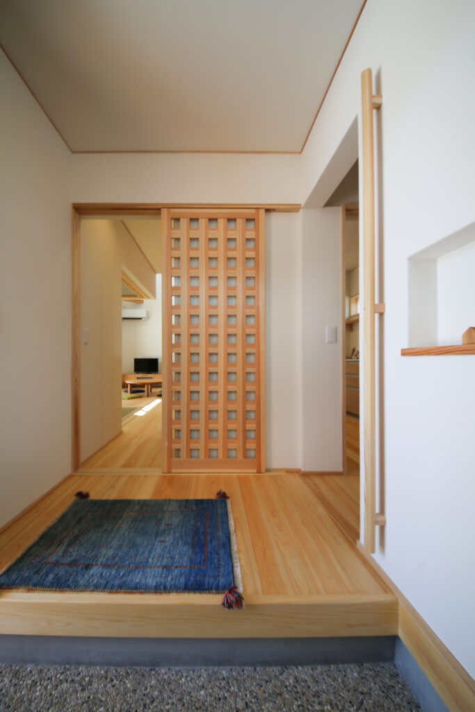 無垢材のオリジナル木製建具が迎えてくれる玄関。リビングとキッチンの2方向へアクセスできる動線を確保。