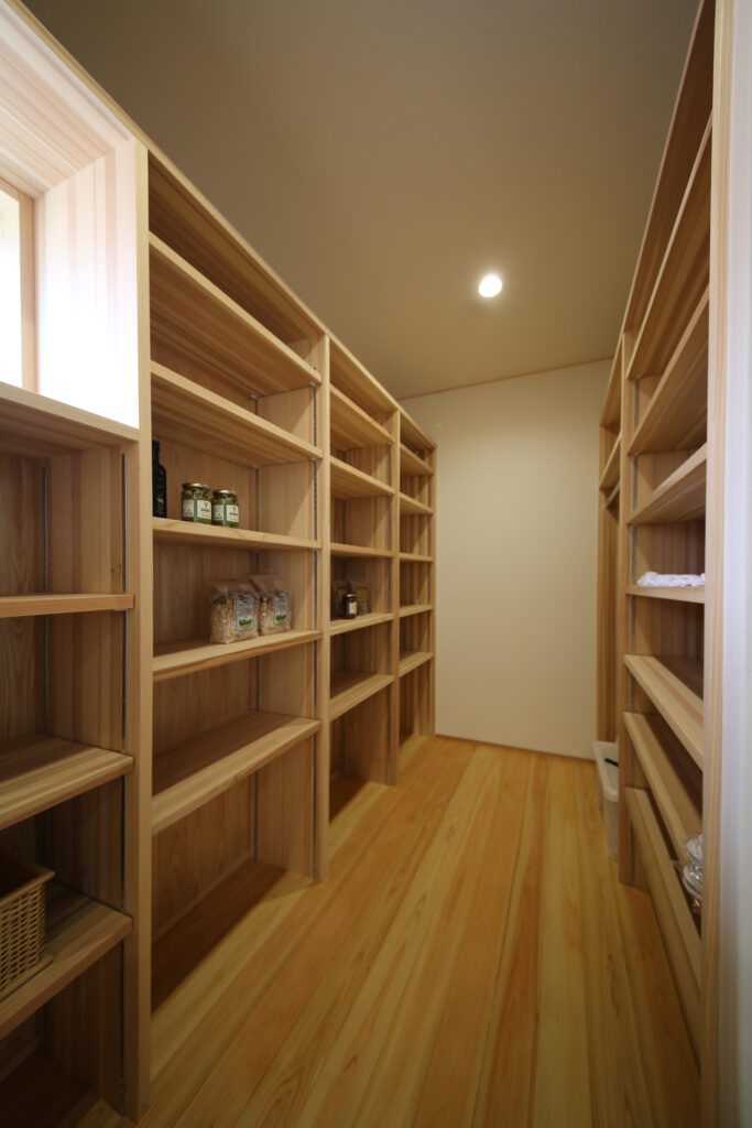 キッチンからもアクセスできるシューズクローク兼食品庫パントリーを設け、収納力を確保。