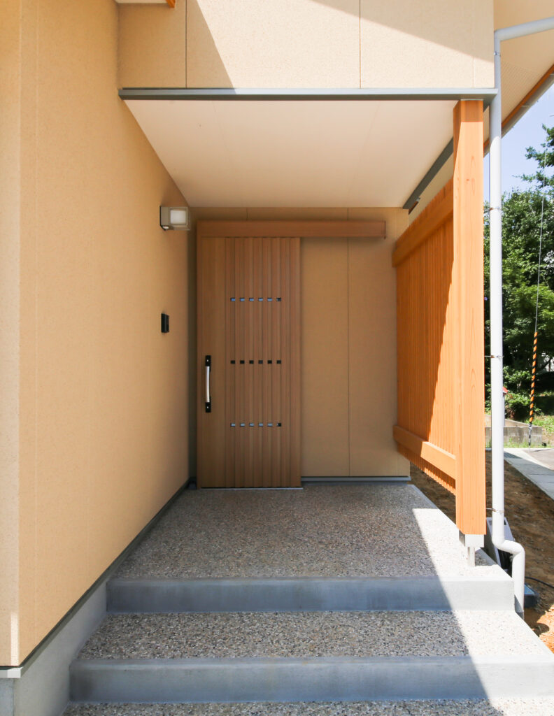 豆砂利仕上げの土間と木製縦格子で和のテイストを取り入れ、落ち着いた印象に。