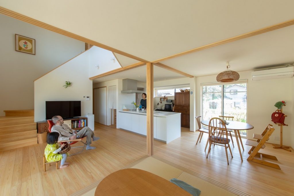 LDKと和室がそれぞれつながり、視線が抜ける大きなひとつの空間に。和室に建具をはめ込めば、プライベートな空間にも。