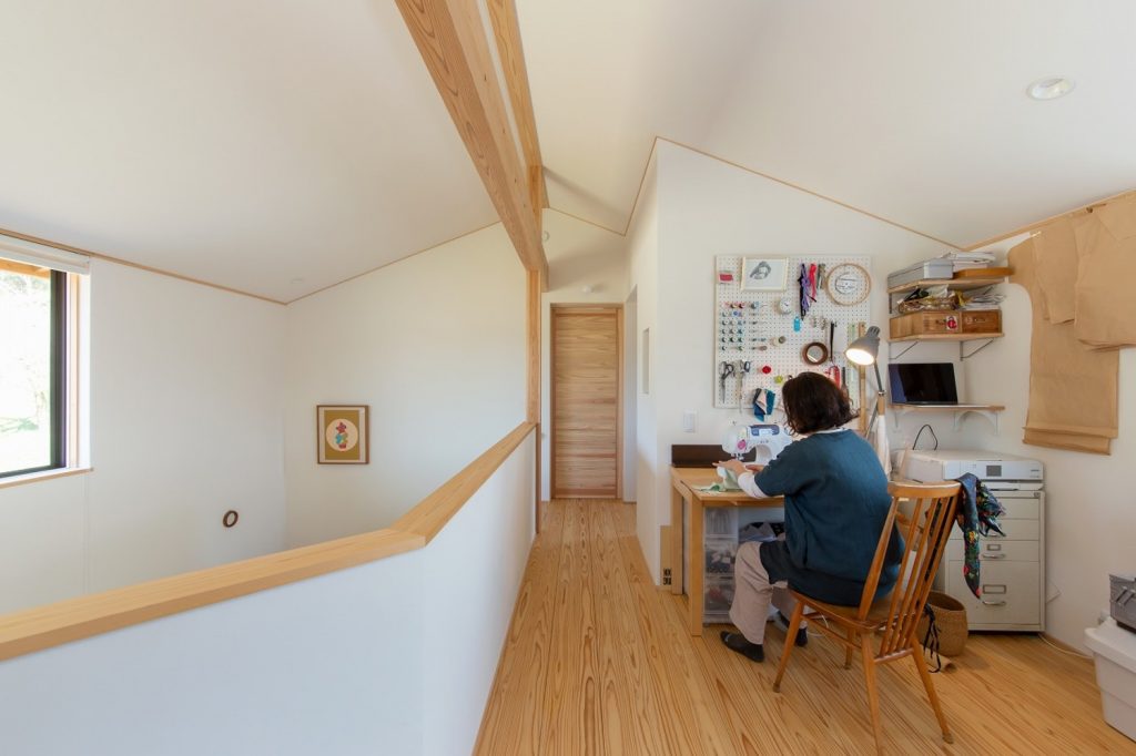 二階の吹き抜けホールを趣味・仕事のスペースに。あえて初めから作り込まないことで、暮らしに合わせて使い方を変えていける場所です。