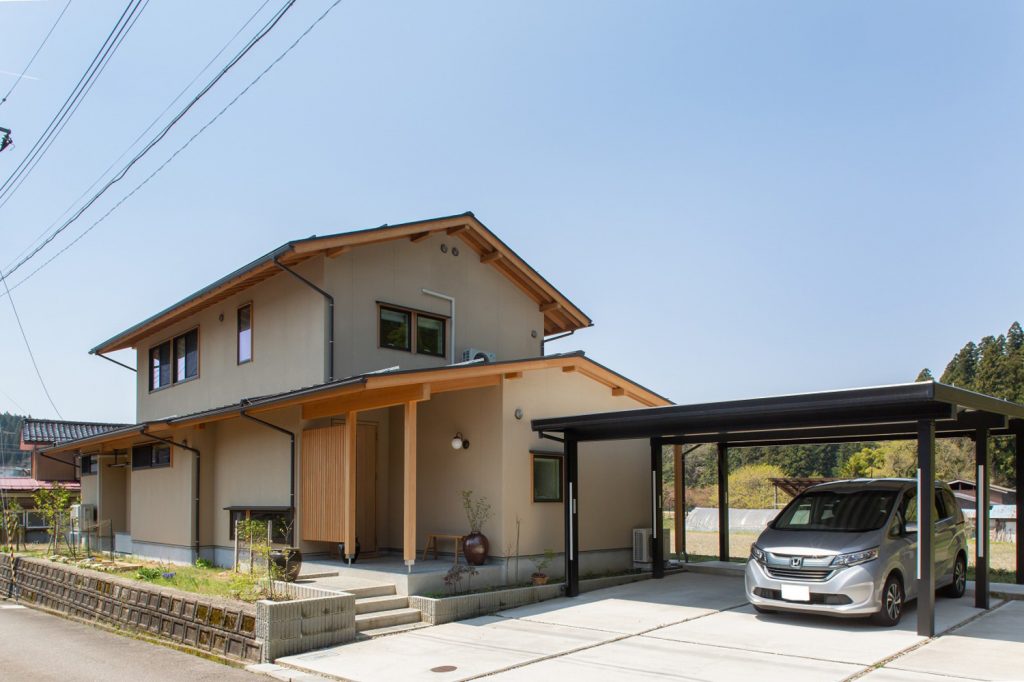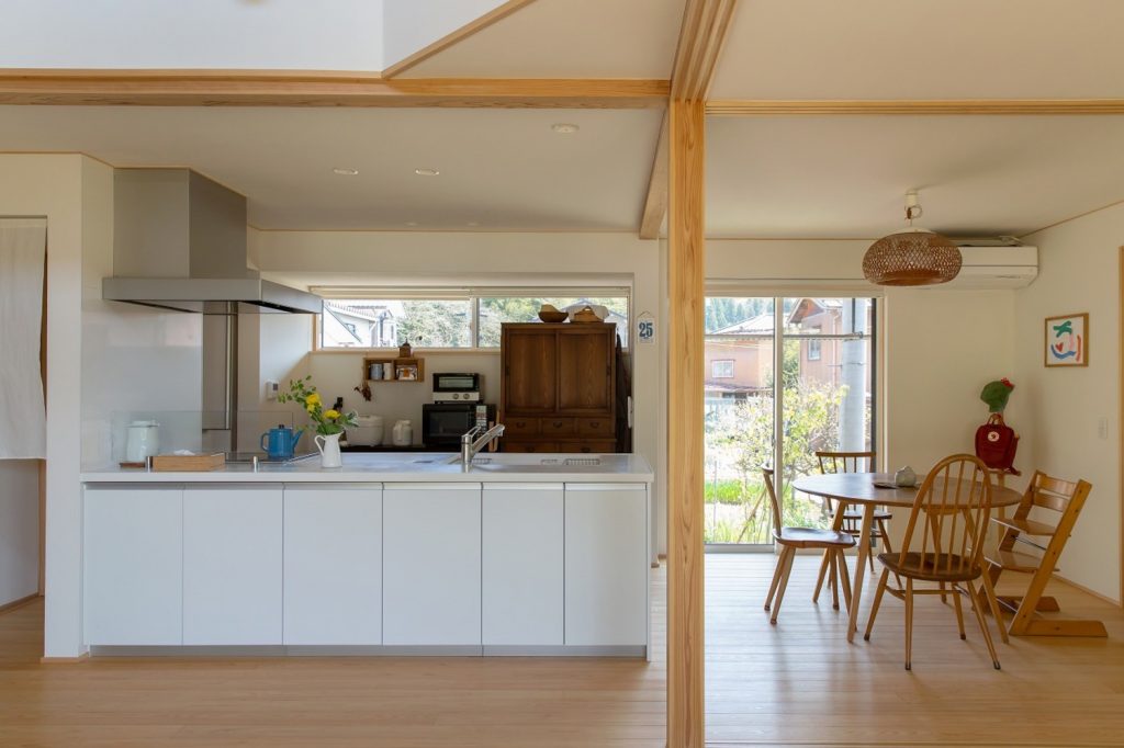 田舎暮らしに憧れ、この地に移住したお施主様。里山の風景と集落の家々に溶け込む和の佇まいは、どこか懐かしく誰が見てもホッとすることでしょう。「家族とともに育っていく家にしたい」と あえて余白を残し、暮らしの変化に合わせて空間の使い方や、家具インテリアを楽しんでゆけるように。リビングの開口いっぱいに広がる里山の自然、国産無垢の素材とそれに馴染む古家具たち。家も家族も、全身で里山のおおらかさを受け止める日本の原風景のような住まいです。
