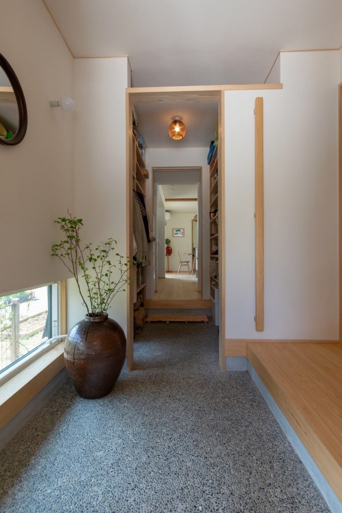 豆砂利の洗い出しや地窓、古道具が落ち着いた雰囲気をつくる玄関。古き良きものを大切にしながら暮らしたい、そんな想いが表れています。
