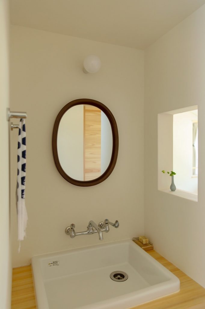 造作洗面は味のある鏡の個性を生かすためシンプルに。機能が沢山ついたものも便利ですが、色々と削ぎ落としたシンプルなものにも魅力があります。