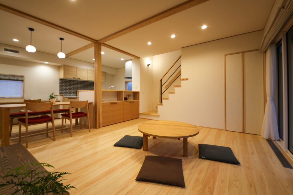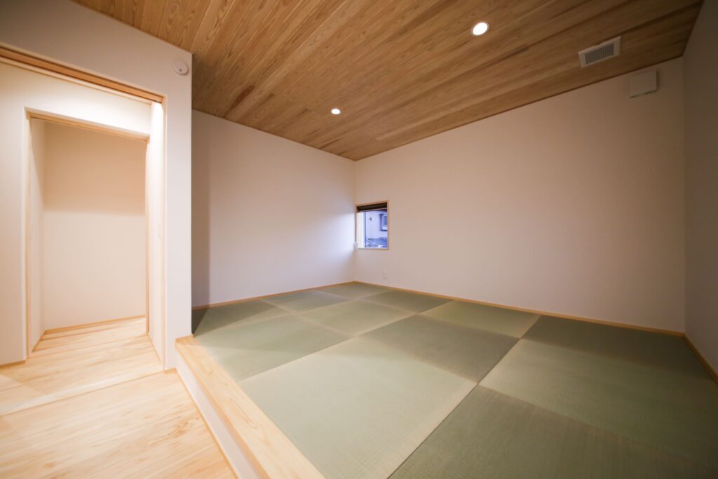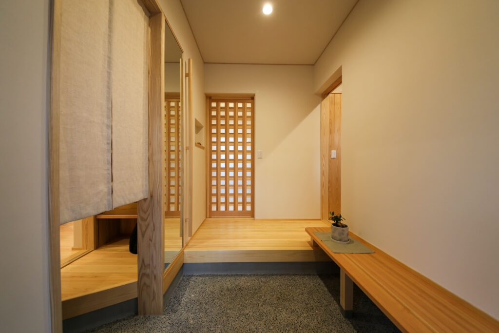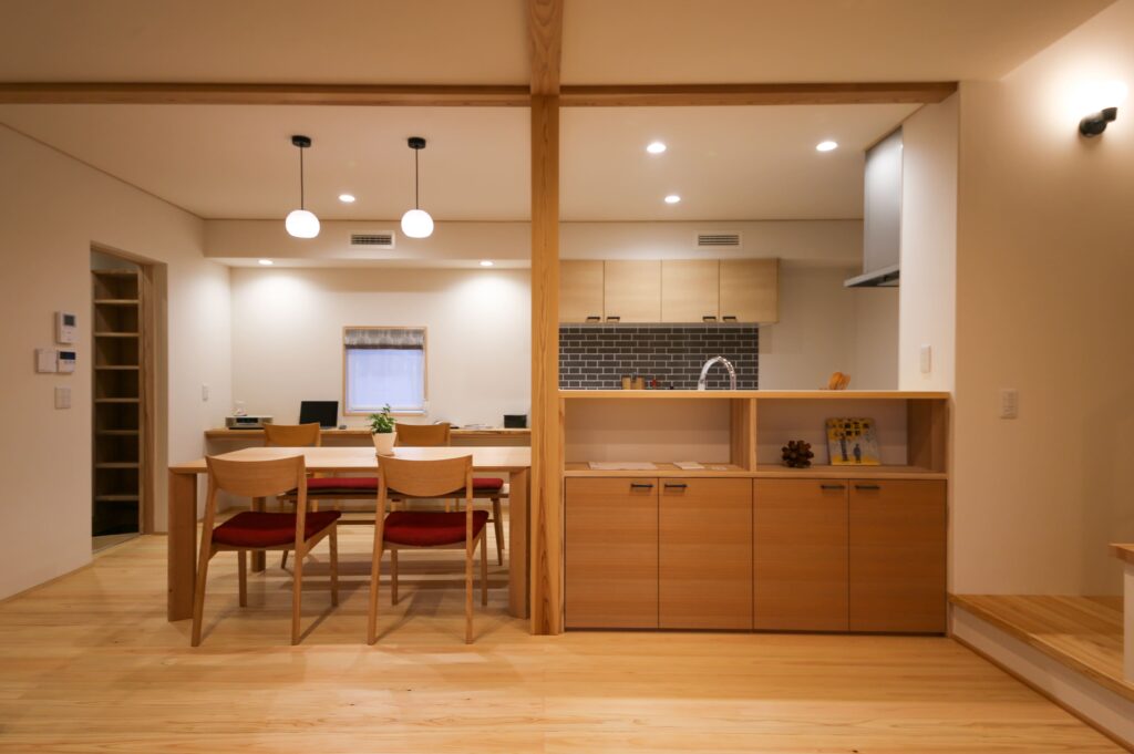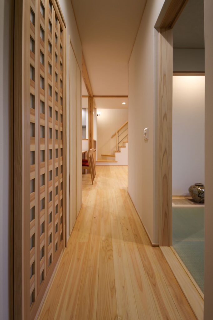 ナレッジライフの完成見学会で家づくりのイメージを膨らませ、計画されたお施主様。ご家族の様々なこだわりを実現した木の家です。寝室は、畳の小上がりに板張りの勾配天井で、旅館に来たような贅沢な空気が漂います。腰を掛けたり荷物を置いたり多目的に使えるベンチを設けた玄関は、パントリーからダイニングへ抜けることができる日々の暮らしに寄り添った動線も確保しました。また全館空調システム「パッシブエアコン」を搭載し、家中どこにいても温度差のない快適な住環境も実現。ご家族それぞれのリズムで過ごせる自分たちらしい暮らしができる木の家をぜひご覧ください!