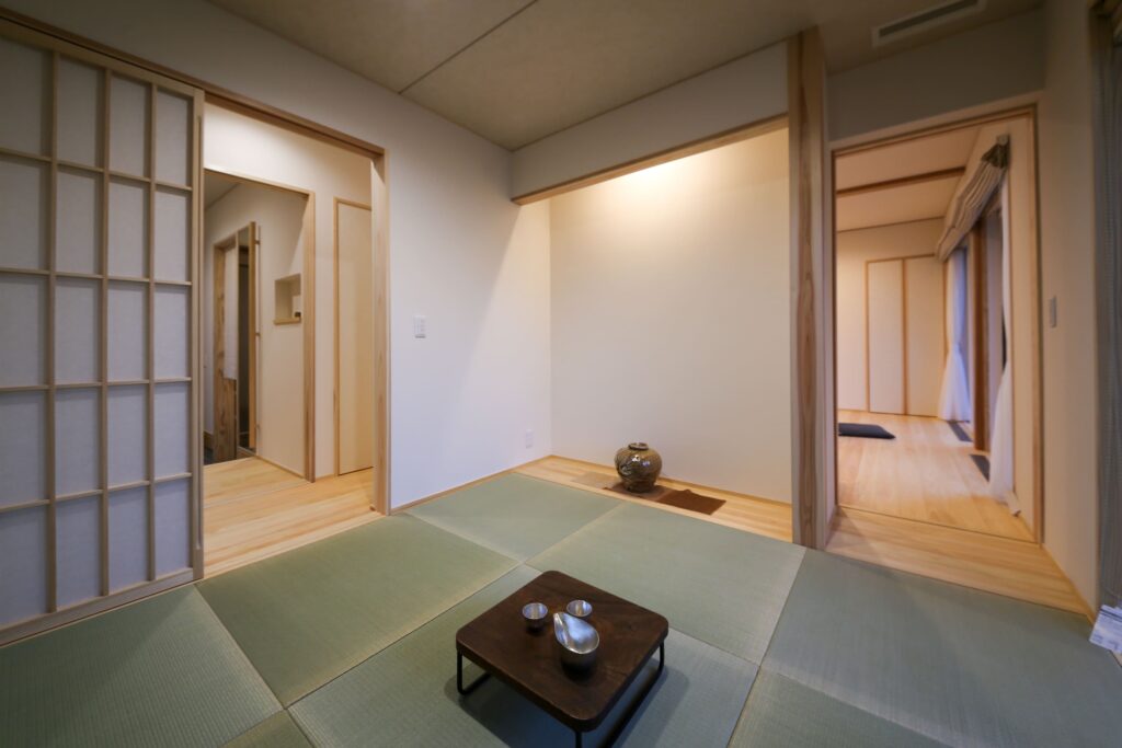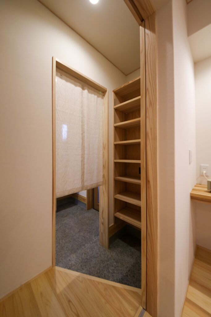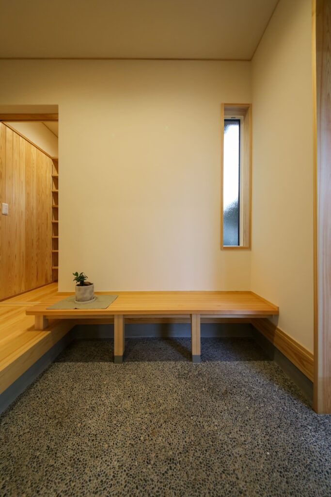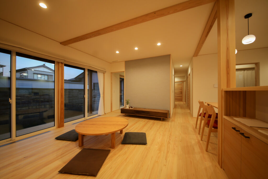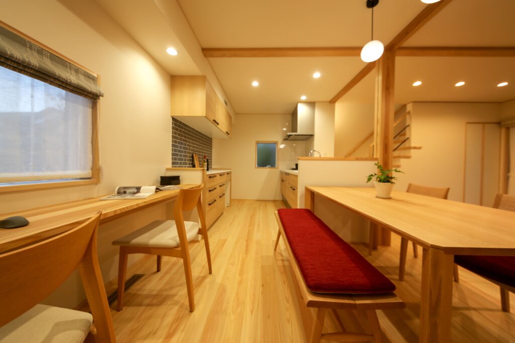 ナレッジライフの完成見学会で家づくりのイメージを膨らませ、計画されたお施主様。ご家族の様々なこだわりを実現した木の家です。寝室は、畳の小上がりに板張りの勾配天井で、旅館に来たような贅沢な空気が漂います。腰を掛けたり荷物を置いたり多目的に使えるベンチを設けた玄関は、パントリーからダイニングへ抜けることができる日々の暮らしに寄り添った動線も確保しました。また全館空調システム「パッシブエアコン」を搭載し、家中どこにいても温度差のない快適な住環境も実現。ご家族それぞれのリズムで過ごせる自分たちらしい暮らしができる木の家をぜひご覧ください!